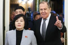 1月16日、モスクワで会談した北朝鮮の崔善姫外相(左)とロシアのラブロフ外相(写真:タス=共同)