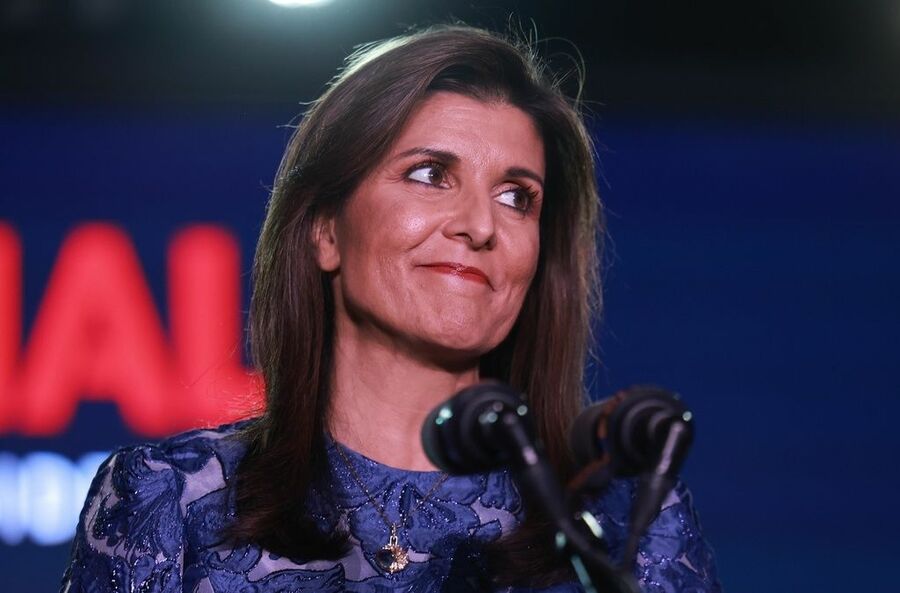 1月23日日、米ニューハンプシャー州予備選の集会で演説するヘイリー元国連大使=同州コンコード(写真:ゲッティ=共同)