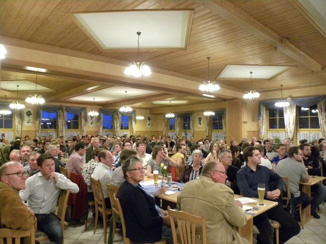 2015年9月にミュンヘン郊外のメッテンハイムで開かれた難民問題に関する説明会。当時のメルケル政権のリベラルな難民政策に対する批判の声が強かった(筆者撮影)