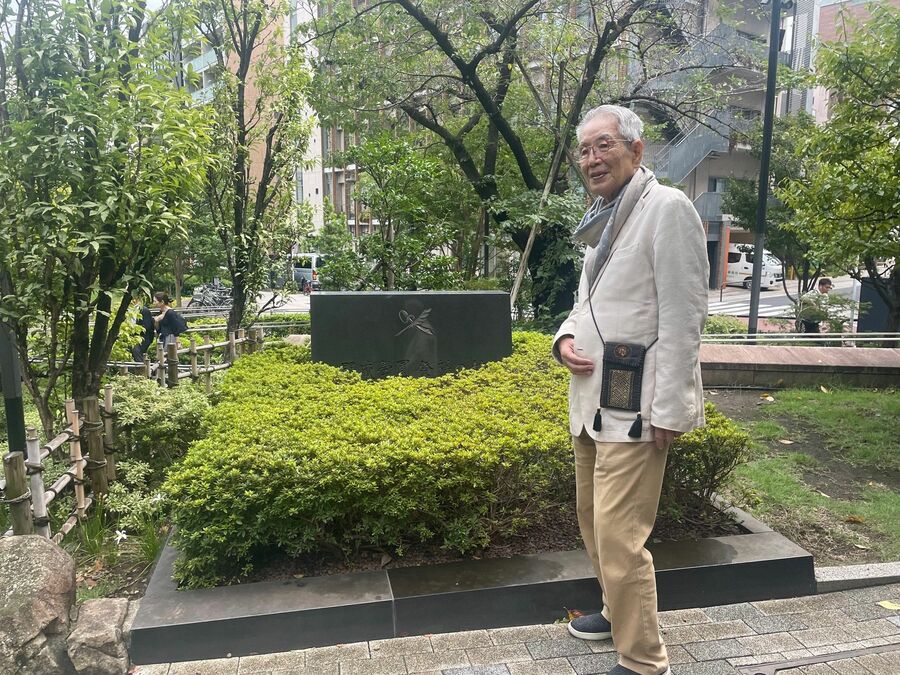 佐野公明氏。学校創立の地・お茶の水に建てられた「開成学園の碑」の前で
