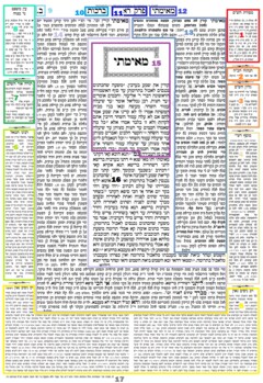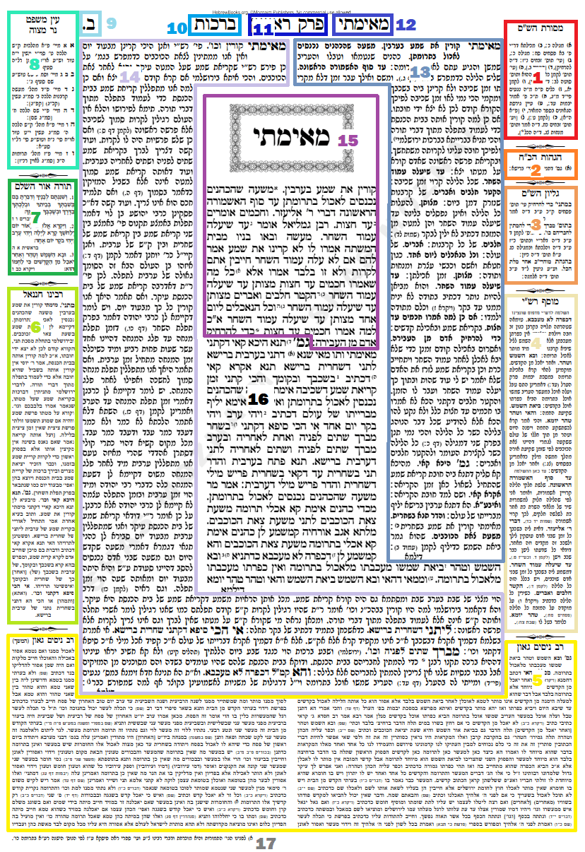 バビロニア・タルムードの最初のページ。枠と番号が示す内容(写真:GordonGlottal, CC BY-SA 4.0 , via Wikimedia Commons)