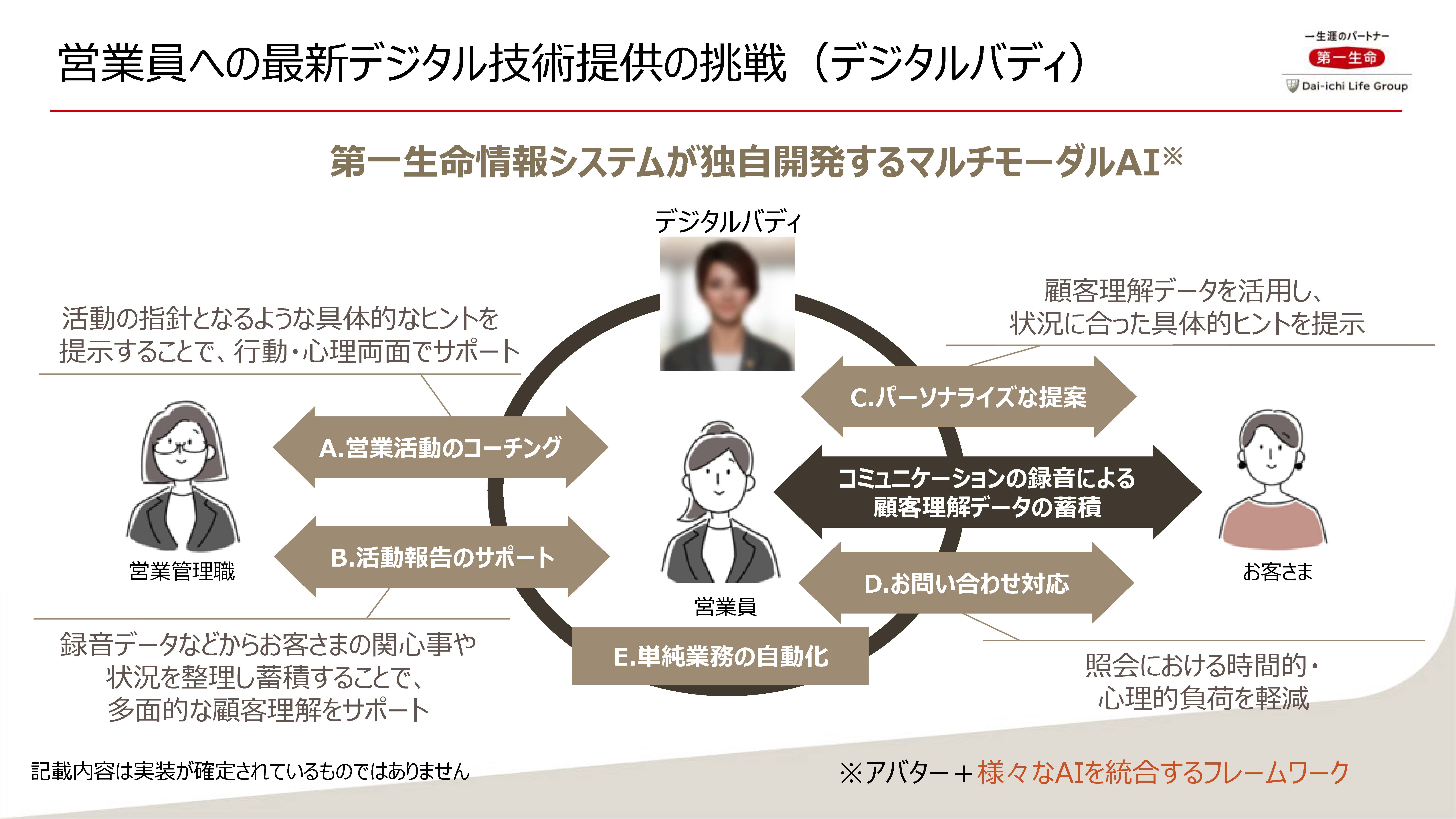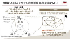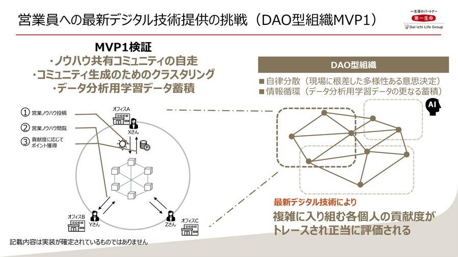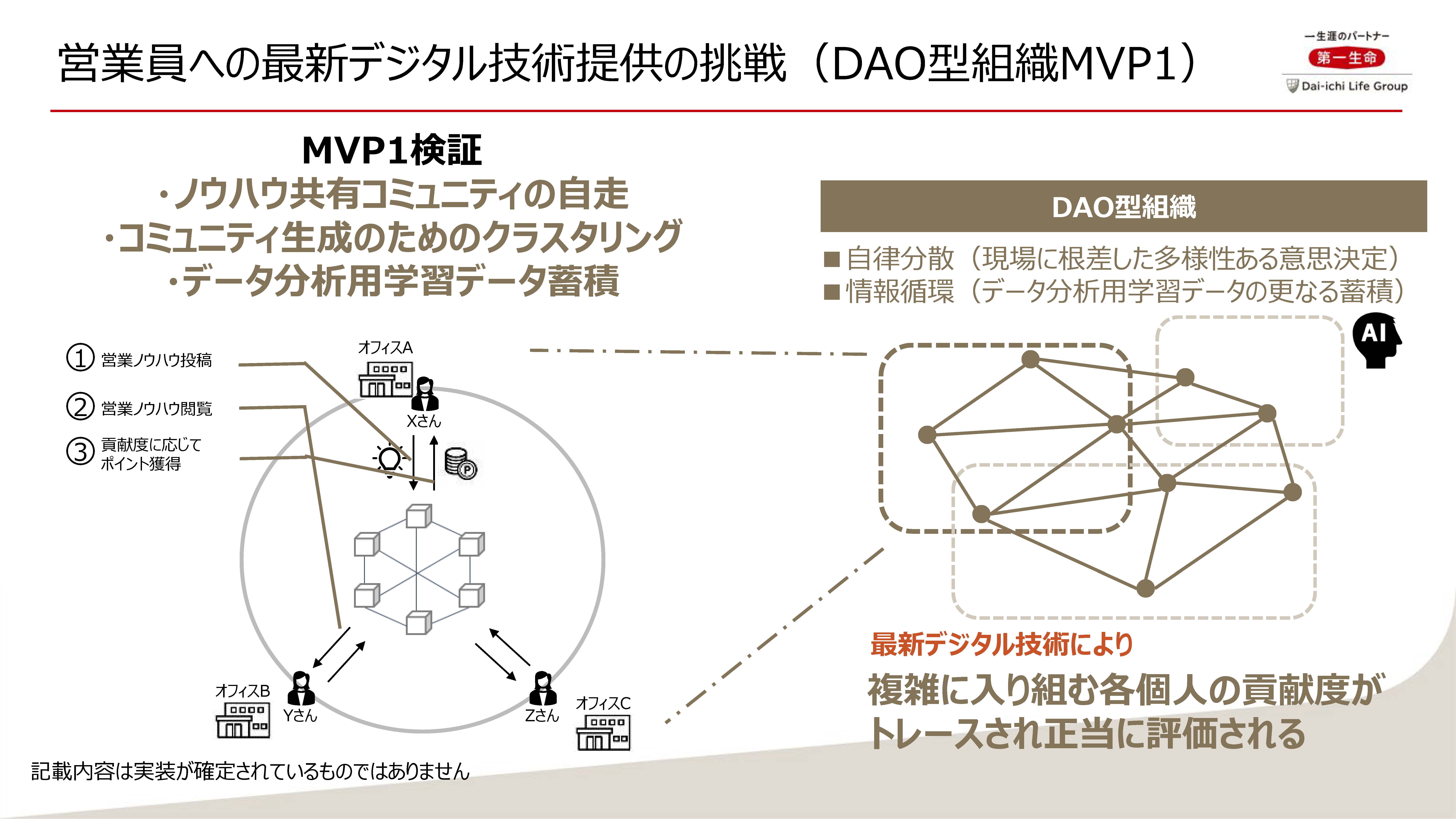 AIやデータ分析基盤をフル活用、デジタルで第一生命の営業はどう変わるのか 第一生命保険 執行役員 DX推進担当の江口武彦氏(写真:今祥雄) (画像1/5) 営業員をAIがサポートするデジタルバディ 拡大画像表示 (画像2/5) 江口 武彦/第一生命保険 執行役員 DX推進担当 大学卒業後、山一證券で投資開発を担当した後、ネット創成期である1995年にネット系スタートアップを創業し9年間経営。その後は、ソフトバンク系投資会社での国内外スタートアップ投資や大企業(日立造船、コニカミノルタ、SOMPO)での新規事業開発に携わる。2021年4月より第一生命にてイノベーション推進に関する業務を担当。 (画像3/5) DAO(Decentralized Autonomous Organization、自律分散型組織)とはWeb3.0で提唱された新たな組織構築の手法。意思決定はメンバーの投票で決定され、決定事項はプログラムで自動実行されるため、人による恣意的な改ざんや不正が発生しない。より良い提案を行ったメンバーには、トークンというインセンティブが贈られる仕組みも有する。第一生命では、DAOが有する機能のうち自社に有用な部分をピックアップし「第一生命向けDAO型組織」を目指している。 拡大画像表示 (画像4/5) (画像5/5) AIやデータ分析基盤をフル活用、デジタルで第一生命の営業はどう変わるのか この写真の記事を読む