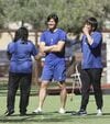 昨年3月20日、WBC日本代表の練習中に話をする佐々木朗希(左)と山本由伸=マイアミ(写真:共同通信社)