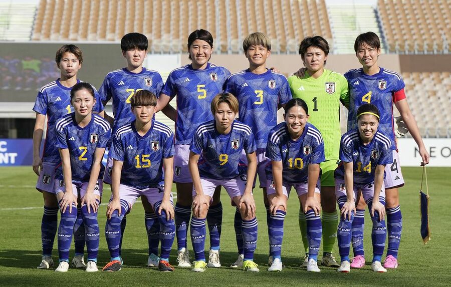 北朝鮮戦に臨む女子日本代表。(前列左から)清水梨紗、藤野あおば、植木理子、長野風花、長谷川唯、(後列左から)田中美南、古賀塔子、高橋はな、南萌華、GK山下杏也加、熊谷紗希(写真:共同通信社)
