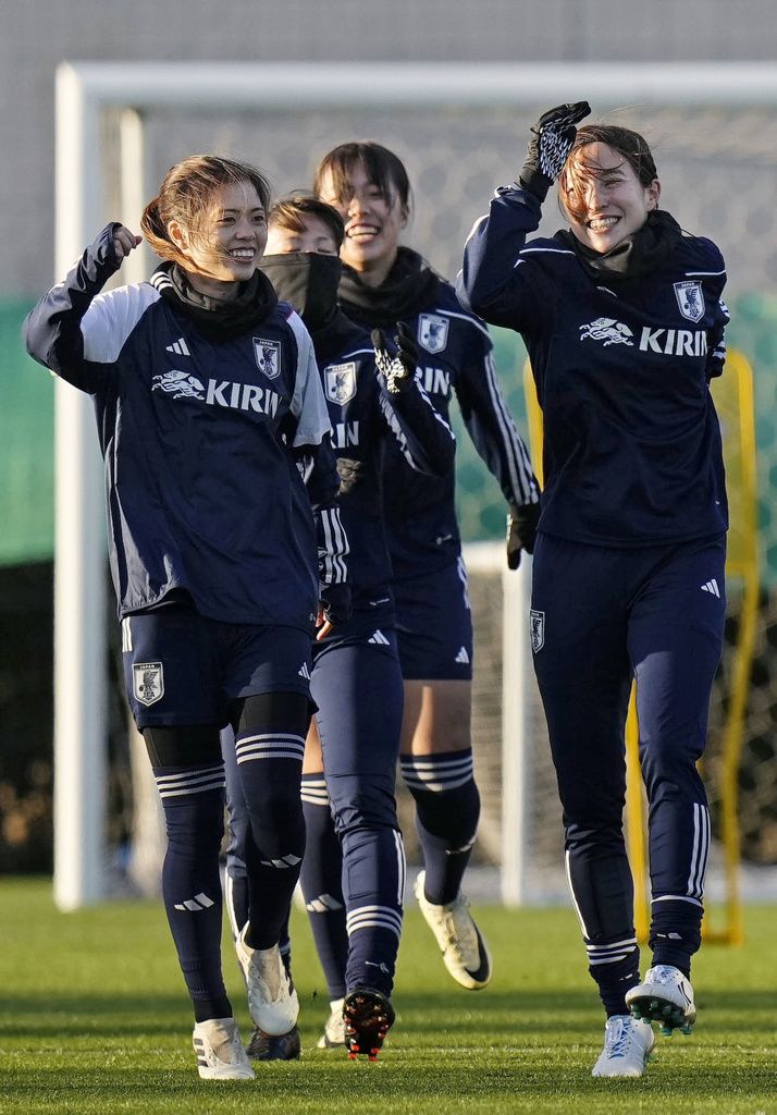 なでしこジャパンは帰国後即練習に取り組んだ。北朝鮮との第2戦に向け、調整する長谷川(左)ら=千葉市内(写真:共同通信社)