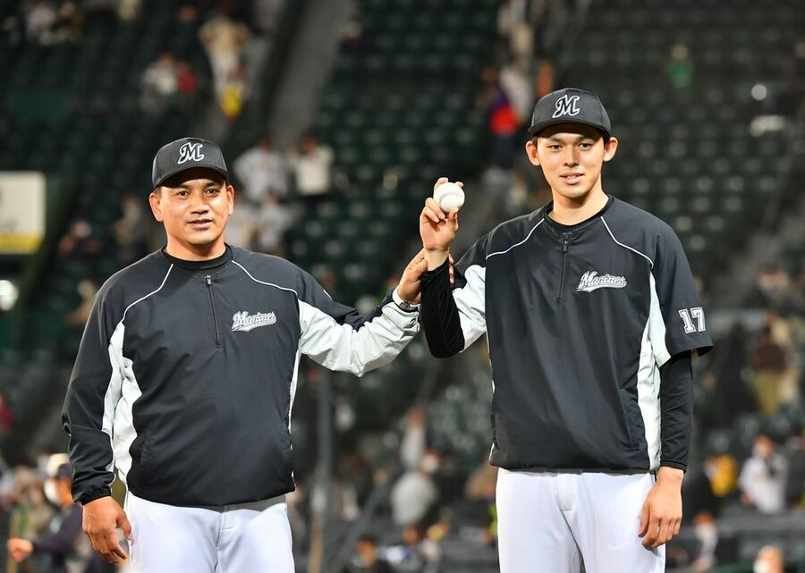 2021年5月27日、プロ初勝利を果たし、ウイニングボールを掲げる佐々木朗希(右)と井口資仁監督(写真:岩手日報/共同通信イメージズ)