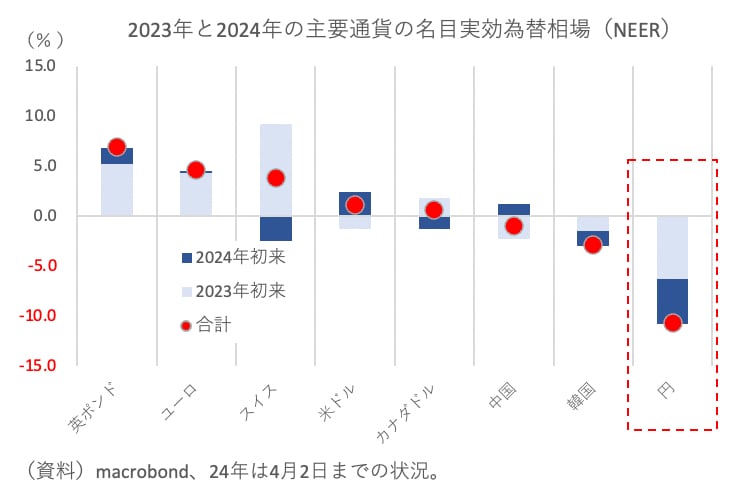 2023年と2024年の主要通貨の名目実効為替相場(NEER)