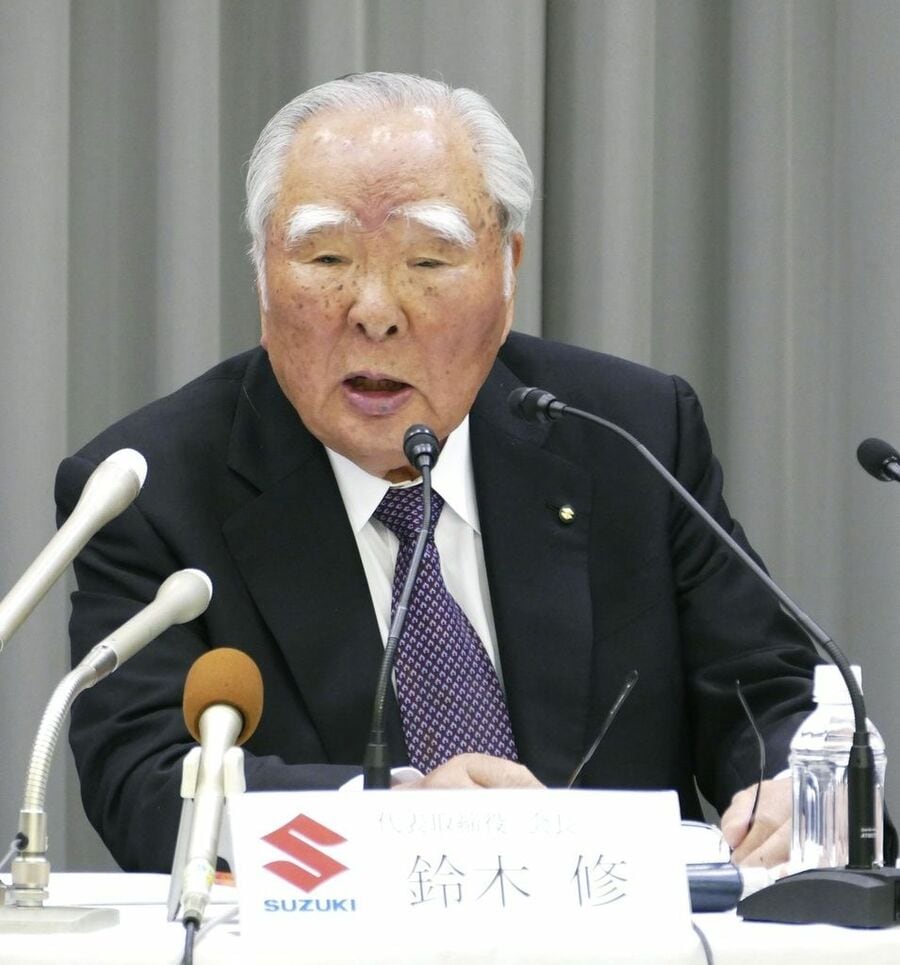 記者会見するスズキの鈴木修会長(当時)=2019年05月10日(写真:共同通信社)