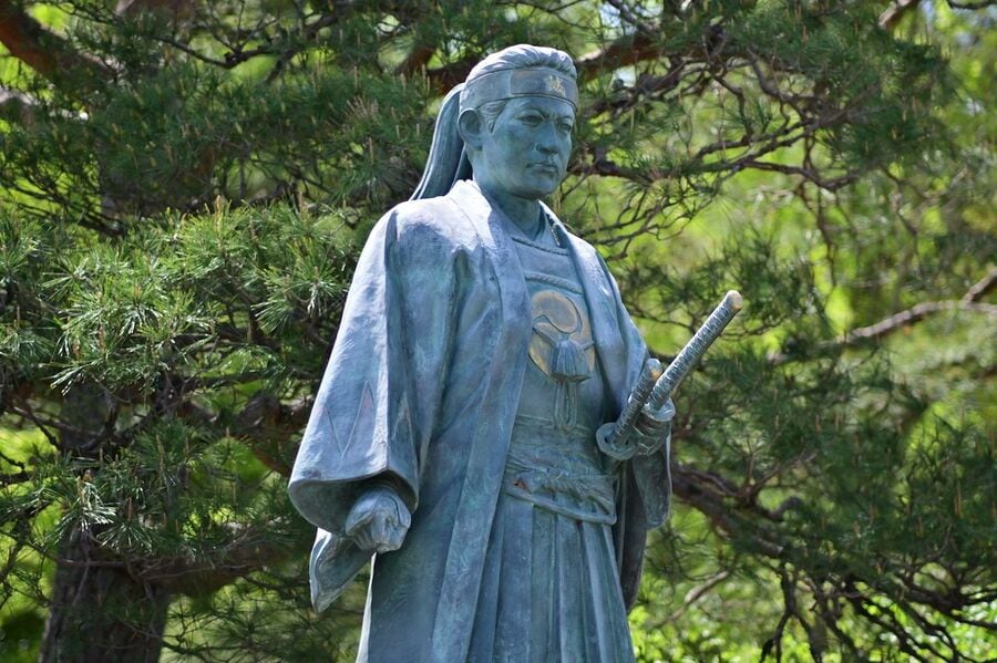 写真2:高幡不動の境内に立つ土方歳三の像。日野は土方の出身地だが、彼の背後の山が城跡だ