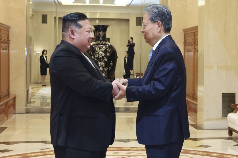 中国・全人代常務委員長が訪朝、金正恩氏と会談(写真:新華社/アフロ)