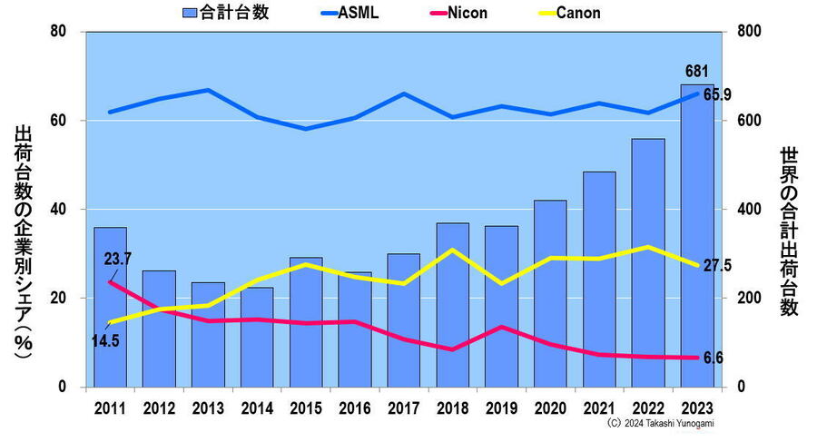 図1 露光装置の出荷額と企業別シェア(~2023年)