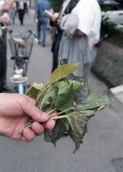 後に「松本サリン事件」と呼ばれる松本市で起きた有毒ガス事件の翌日、現場近くの池付近で採取された植物の葉は一部が変色していた(写真:共同通信社)