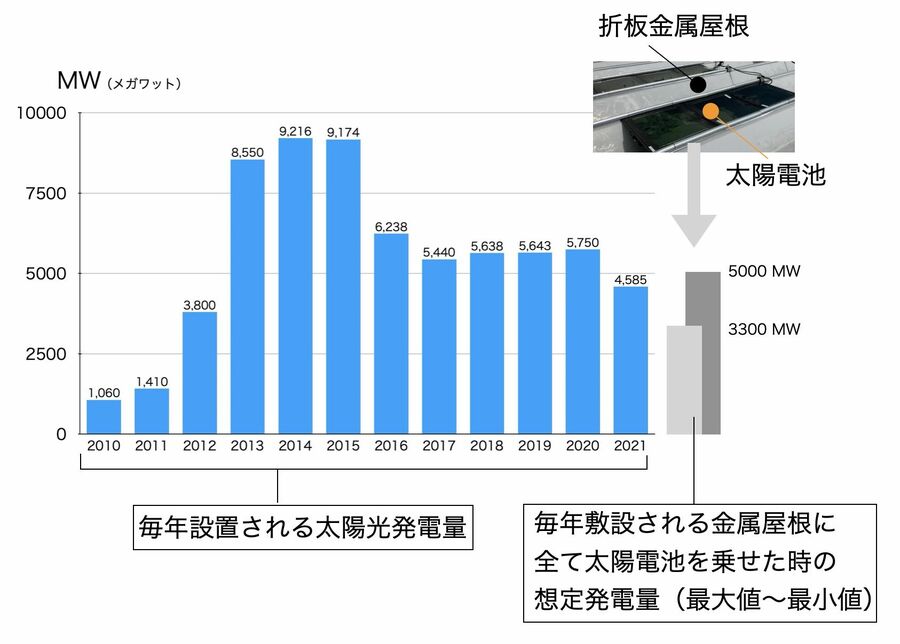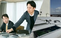 ペロブスカイト太陽電池で「どこでも発電所」実現へ 日揮が乗り出す次世代太陽電池ビジネスの勝算 〈左〉日揮 未来戦略室 室長の五十嵐知之氏(左)とアシスタントマネージャーの永石暁氏(右)。(写真:矢島幸紀)/〈右〉北海道、苫小牧で始まった実証実験の様子。折板屋根の上にある黒いシートがペロブスカイト太陽電池だ。「霧の苫小牧」という呼び名があるほど、苫小牧は曇りの日が多いが、太陽光が弱くても発電できるペロブスカイトの特徴を確認する意味でも苫小牧は実験に適地とのこと (画像1/13) 五十嵐 知之/日揮 未来戦略室長 2004年入社。海外にてビジネスマネジメントや事業開発に従事する傍ら、ライフワークとして社内有志と共にアグリビジネス開発に携わる。2015年にロシアで野菜生産・販売事業会社を立ち上げ。4年間経営に携わった後、帰国し、現職で会社変革の起爆剤となるべく経営企画や新規事業開発を担当。 (画像2/13) 永石 暁/日揮 未来戦略室 アシスタントマネージャー 2010年入社。国内外のプロジェクトにて機械系エンジニアを10年ほど経験した後、自ら新たな事業を生み出したいとの思いから現部署に異動。経営企画では中期経営計画に携わりながら、新規事業開発とCVCファンドとの取り組みでエネルギーを担当。「どこでも発電所」事業ではプロジェクトマネージャーとして事業化にまい進中。 (画像3/13) 一般的な折板屋根。簡易で安価ということから多くの工場や倉庫で利用されている (画像4/13) 工場、倉庫等、大型建造物の屋根材の比率(2021年)。折板屋根を含む金属屋根材が圧倒的に多い(5万65キロ平方メートル)。ちなみにスレートとはセメントを材料とする屋根材のこと。〔出典〕日本金属屋根協会の資料から著者作成 拡大画像表示 (画像5/13) 一般家屋に設置されたシリコン太陽電池パネル。重量や強風に耐えられる頑丈な作りになっていることも総重量を押し上げる (画像6/13) 日揮が想定する簡易な設置方法。遮熱シートにペロブスカイト太陽電池を貼り、シートそのものを屋根に留め具で固定する。重いシリコン系太陽電池を頑丈なフレームで固定していた工程と、比較にならないほど簡易になる。〔出典〕日揮のYouTubeチャンネルの情報を基に著者作成 拡大画像表示 (画像7/13) 遮熱シートにペロブスカイト太陽電池を貼ったモデル。下の山型部分は折板屋根 (画像8/13) 折板金属屋根が有する太陽光発電場所としてのポテンシャルを示すグラフ。毎年、設置される太陽光発電は直近5年で約5000MWほどだが、毎年敷設される金属屋根の全てに太陽光発電設備を乗せた場合、最大5000MWから最小3300MWの発電※1が可能。つまり、折板屋根だけで毎年設置される太陽光発電設備による発電量、約5000MWを賄える面積を有する。 拡大画像表示 (画像9/13) 左がエネコートテクノロジーズの社名ロゴ。Coatは「塗る」の意味で、ペロブスカイト素材を「塗って」太陽電池を作る点を強調した社名となっている。右は曇りでも室内でも発電可能を意味する「どこでも電源」という同社のトレードマーク (画像10/13) 堀内 保/エネコートテクノロジーズ 取締役執行役員 最高技術責任者 製紙メーカーにて材料開発、電機機器メーカーにて材料やデバイス開発に従事。専門は有機合成化学、有機デバイス開発。学術論文(査読付)8報のうち1報は被引用件数1300を超え、特許は国内外120件以上取得実績有。2022年3月 エネコートテクノロジーズ取締役に就任。 (画像11/13) 緑色の円筒がペロブスカイト太陽電池。円筒にすることで、あらゆる方向からの太陽光を発電につなげられる。〔出典〕KDDI (画像12/13) 必ず事業化するという強い気持ちを内外に示すために、日揮では「どこでも発電所」というロゴメッセージを考案し、商標登録出願も済ませた (画像13/13) ペロブスカイト太陽電池で「どこでも発電所」実現へ 日揮が乗り出す次世代太陽電池ビジネスの勝算 この写真の記事を読む
