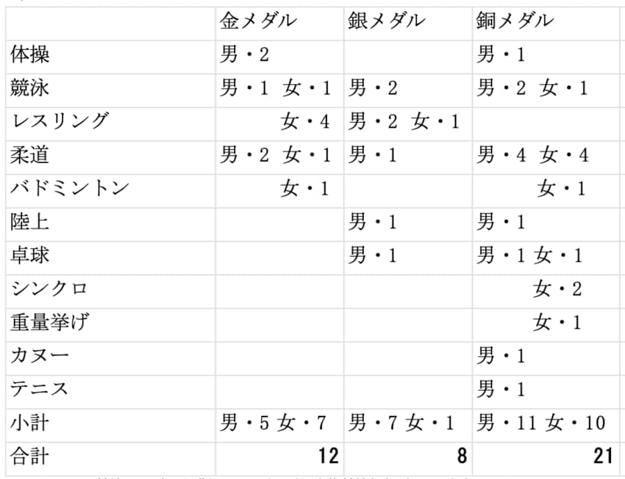 東京オリンピックで日本代表がメダルを獲得した競技と数