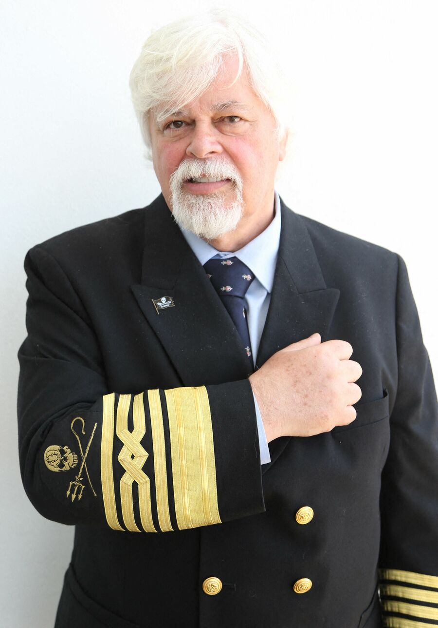 2016年5月、第69回カンヌ国際映画祭のポジティブ・プラネット・カンファレンスに出席した際にカメラの前でポーズを決めるポール・ワトソン。 袖にシーシェパードの紋章をあしらった船長服に身をつんでいる(写真:Domine Jerome/ABACAA/共同通信イメージズ)