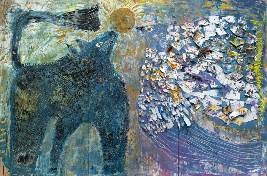 ミロコマチコ《2匹の声》2022年 アクリル、木製パネル 作家蔵 Photo: Yuichiro Tamura