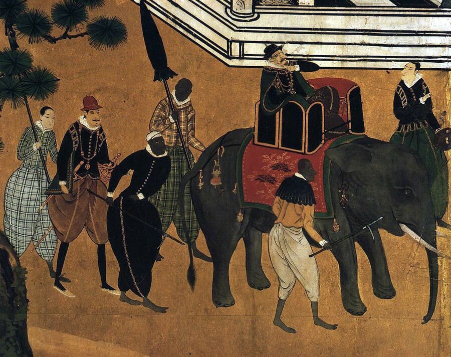 狩野内膳『南蛮屏風』には、黒人の従者と象使いが描かれている