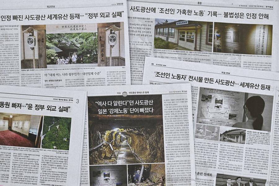 「強制労働」の表現がないことを批判する韓国各紙(写真:共同通信社)
