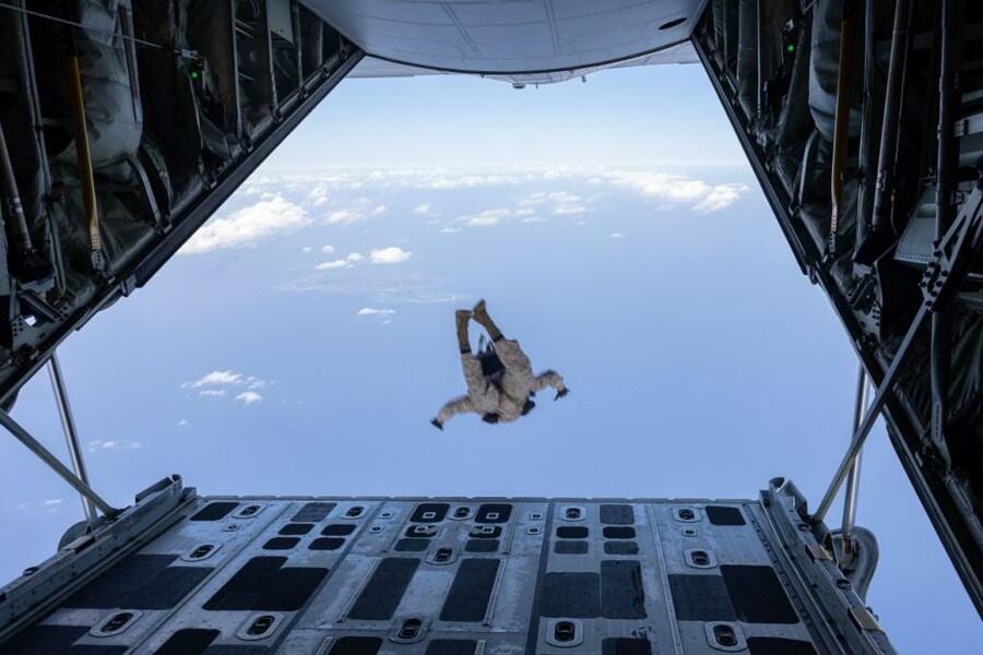 米軍の輸送機「C-130」から落下訓練を行う海兵隊員(2023年10月26日撮影、米海兵隊のサイトより)