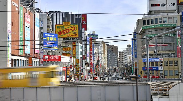 高田馬場駅から見た早稲田通り。かつてはこのように日本人向け広告看板が並んでいたが、いまや中国人向けの看板ばかりが目立つ(写真:Ryuji / PIXTA)