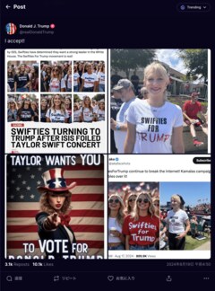 トランプ対ハリスでも深まる懸念、ネットにあふれるフェイク・コンテンツから選挙を守るには……? ジョージア州で遊説するハリス候補(写真:UPI/アフロ) (画像1/2) 「True Social」で共有されたテイラー・スウィフト氏の偽画像(https://truthsocial.com/@realDonaldTrump/posts/112984762512136574) (画像2/2) トランプ対ハリスでも深まる懸念、ネットにあふれるフェイク・コンテンツから選挙を守るには……? この写真の記事を読む