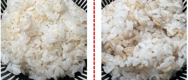 1合あたりに50gを混ぜて炊いた状態。左が白米好きのためのもち麦、右が従来のもち麦(画像提供:株式会社はくばく)