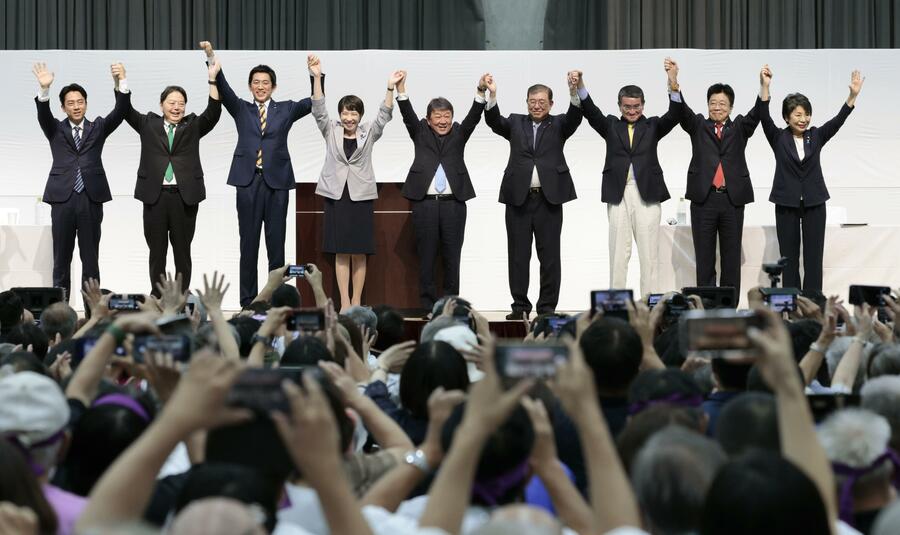 9月20日、松江市での演説会終了後、互いに手を取り合う自民党総裁選の候補者たち(写真:共同通信社)