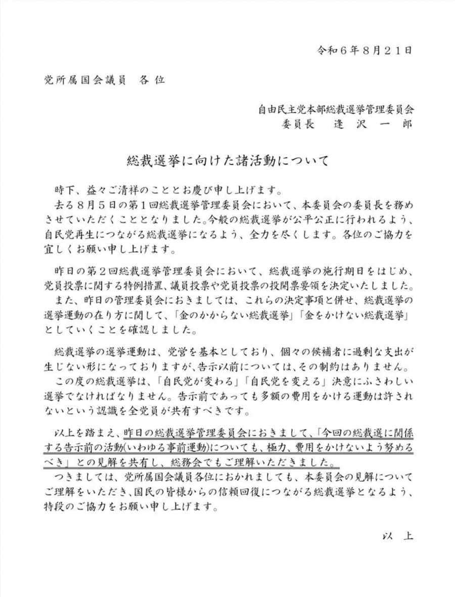 笑ってはいけない自由民主党総裁選、高市陣営が党員向けリーフレット配った件で空中戦が発生 盛り上がっている総裁選だが、選挙に関するルールは紳士協定で、罰則などは特に定められていない(写真:共同通信社) (画像1/3) 8月21日に自民党選管から逢沢一郎さんの名前で出された書面。「自民党が変わる」「自民党を変える」決意に相応しい選挙とするために「今回の総裁選に関係する告示前の活動(いわゆる事前活動)についても、極力、費用をかけないよう努めるべき」と通達している 拡大画像表示 (画像2/3) 立憲民主党の新代表に選出された野田佳彦元首相。仮に高市氏が新総裁・総理になり、急進的な保守・タカ派のスタイルで政権運営を掲げて解散に打って出た場合、中道票はどこに行くのだろうか(写真:共同通信社) (画像3/3) 笑ってはいけない自由民主党総裁選、高市陣営が党員向けリーフレット配った件で空中戦が発生 この写真の記事を読む