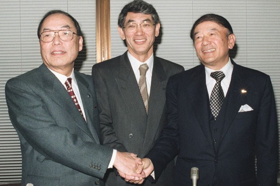 セガ会長時代の大川功氏(写真左/1997年撮影:共同通信社)