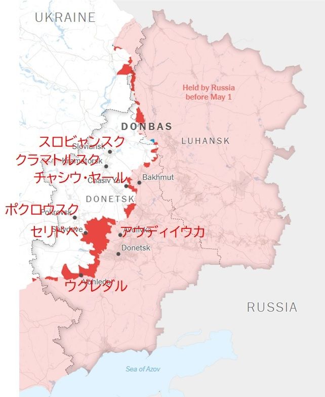 濃い赤色が5月1日以降にロシアが占領した地域で、濃い青色がウクライナが占領した地域。出典:戦争研究所(ISW)のデータを基に作成したもの