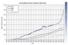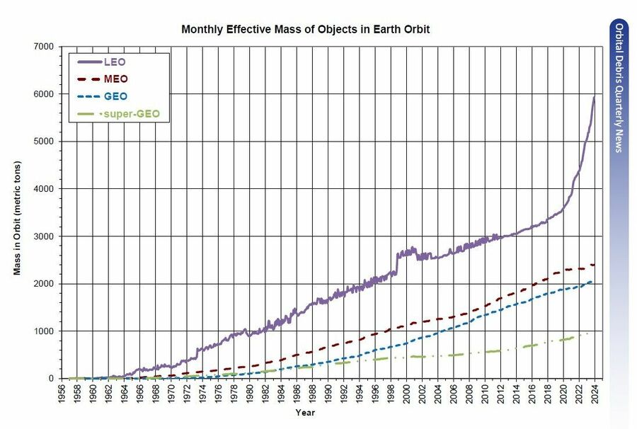 NASAのODPO(軌道デブリプログラムオフィス)が2024年4月に公表した宇宙機の増加グラフ。下のヨコ軸は年、左のタテ軸はトンを示す。特に2020年以降、高度2000km以下の低軌道(Low Earth Orbit, LEO)を航行する宇宙機が激増していることが分かる。ⒸNASA Orbital Debris Program Office (ODPO)