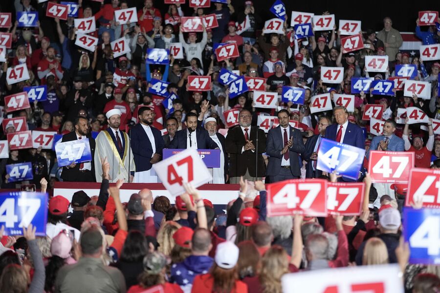 大統領選の選挙集会で、地元のイスラム教指導者たちと並ぶトランプ氏(写真:AP/アフロ)