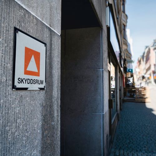 スウェーデンの町中で数多見かける民間防衛シェルター。オレンジ色の四角形の中に白い三角形のマークが目印(写真:MSB Facebookより)