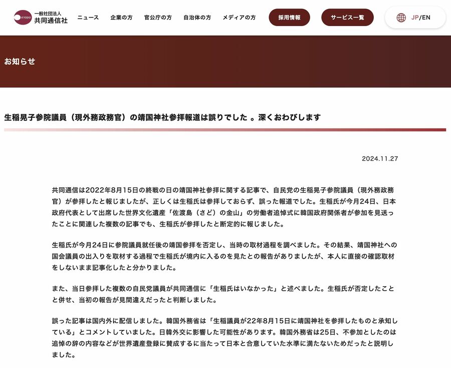 共同通信の“内部文書”が明かす、生稲氏の靖国参拝誤報はなぜ起きたのか 「佐渡島の金山」での労働者追悼式に出席した生稲晃子外務政務官(写真:AP/アフロ) (画像1/3) 共同通信社のウェブサイトに掲載された「おわび」 (画像2/3) 共同通信社が11月26日付で加盟社の編集責任者宛に送付した文書 (画像3/3) 共同通信の“内部文書”が明かす、生稲氏の靖国参拝誤報はなぜ起きたのか この写真の記事を読む