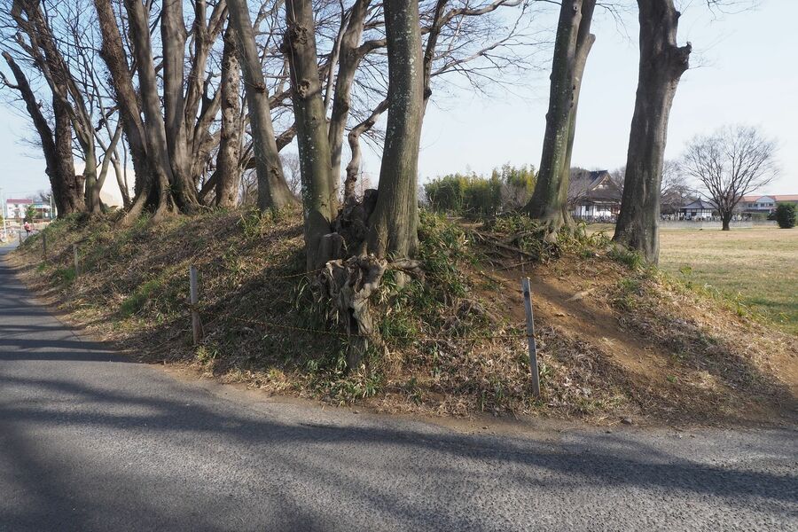 河越館跡に残る土塁。右手遠方に常楽寺が見える
