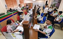 日本行きが決まり、書類手続きをする技能実習の候補生たち(右側)。「整列」という習慣を学ぶため、日本の役所の窓口を模したつくりになっている