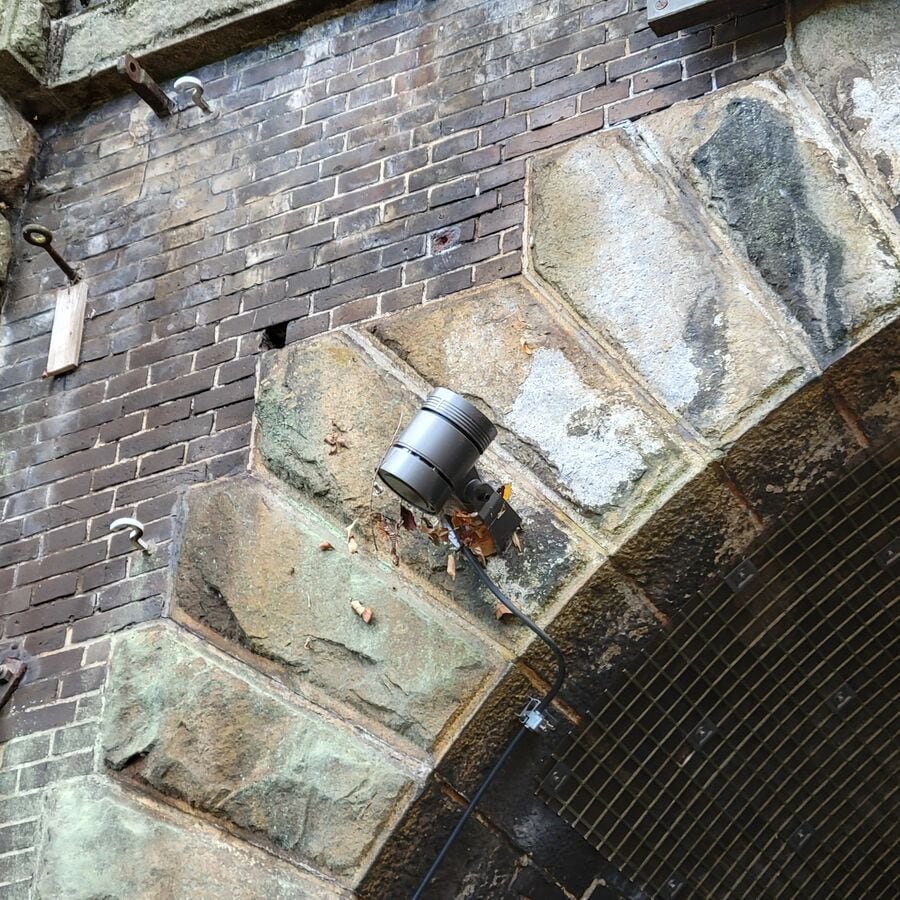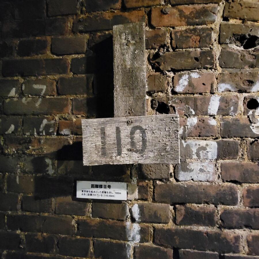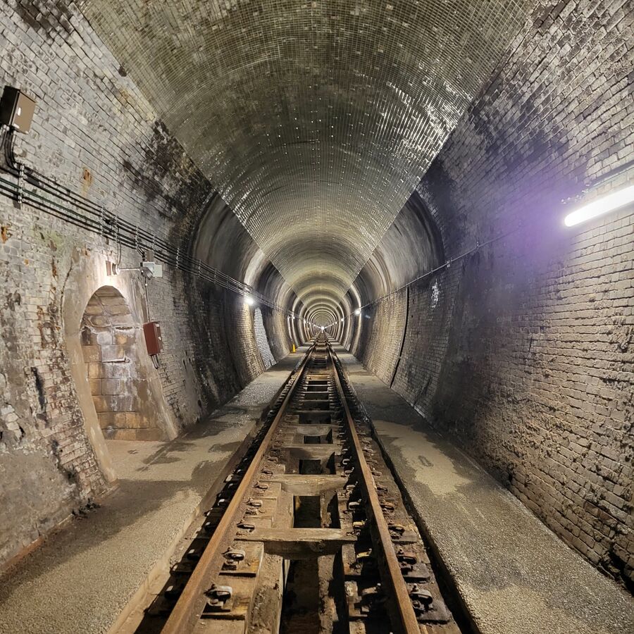 線路中央に設けられた排水用の水路。天井部に見えるのは安全対策用のネットで、煉瓦が透けて見え、歴史あるトンネルの雰囲気を損ねないよう配慮している