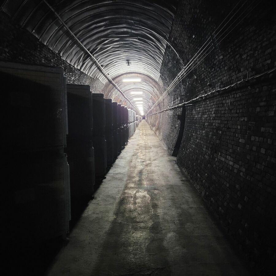 約1100mのトンネルの最奥部までラックが並び、普段は消灯され煉瓦内の温度、湿度の安定した環境のもとで保管されている(特別な許可を得て撮影)