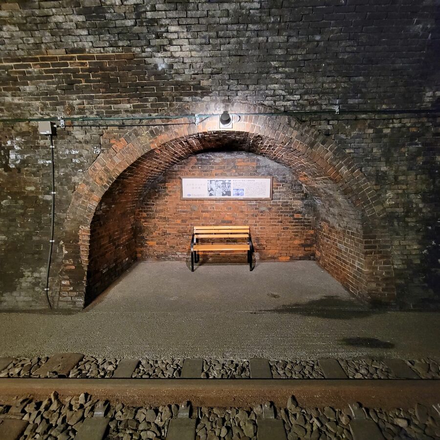 煉瓦造りの大型の待避所は2カ所設けられており、写真入りの説明板のほか、休憩用のベンチもある
