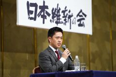 日本維新の会の臨時党大会であいさつする吉村洋文大阪府知事(写真:共同通信社)