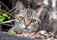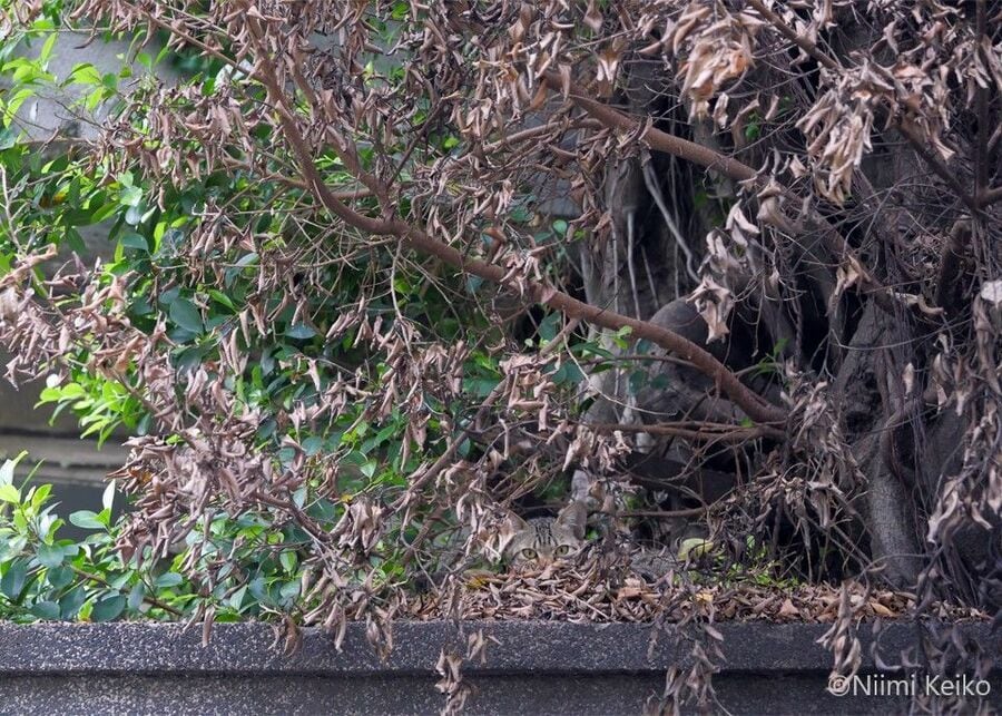 猫はどこにいるでしょうか?「どうして見つかったのだろう」と身を乗り出した瞬間の顔です