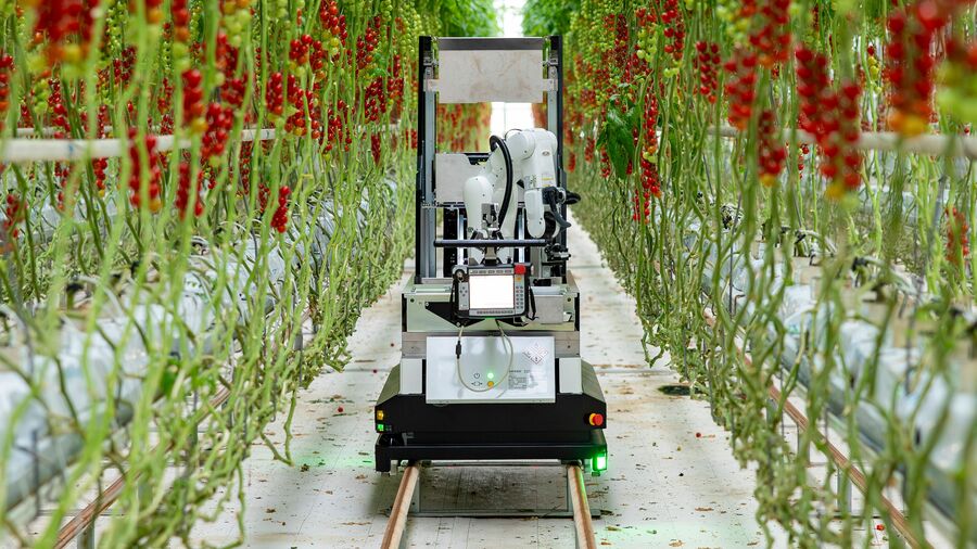 房取りミニトマトの全自動収穫ロボット「Artemy®」ハウス内の走行レーンを自動走行し、AIがミニトマトの熟度を判定、成熟した房のみを選んで収穫ロボットアーム先端に取り付けられたハサミを用いて果柄を切断し、積載している収穫箱に収納する。自動レーンチェンジ、収穫箱の自動交換もできる