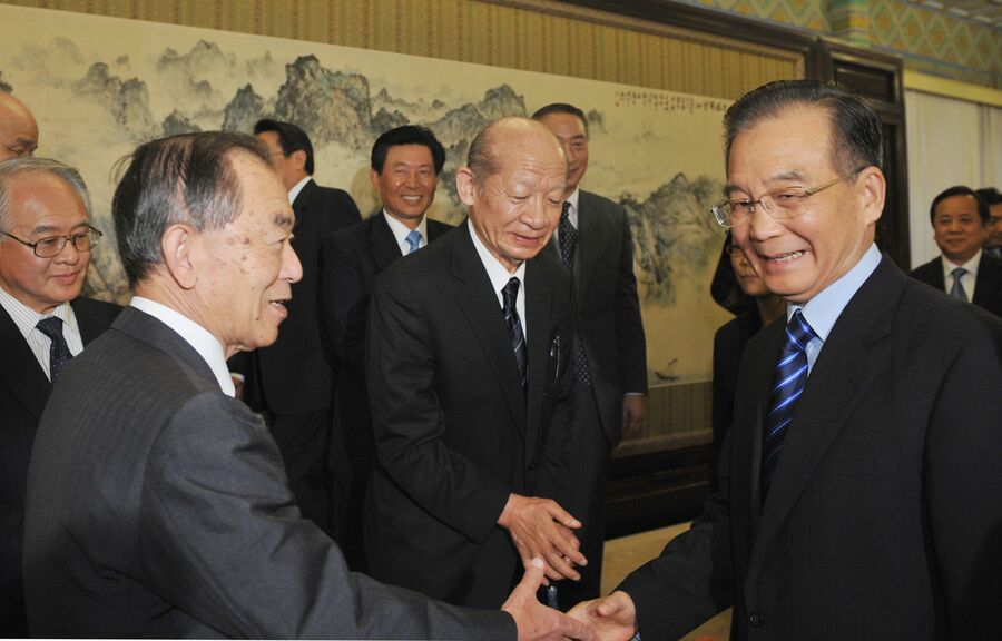 2011年11月、北京で中国の温家宝首相と握手する元伊藤忠商事会長の丹羽宇一郎・駐中国大使(写真:代表撮影/ロイター/アフロ)