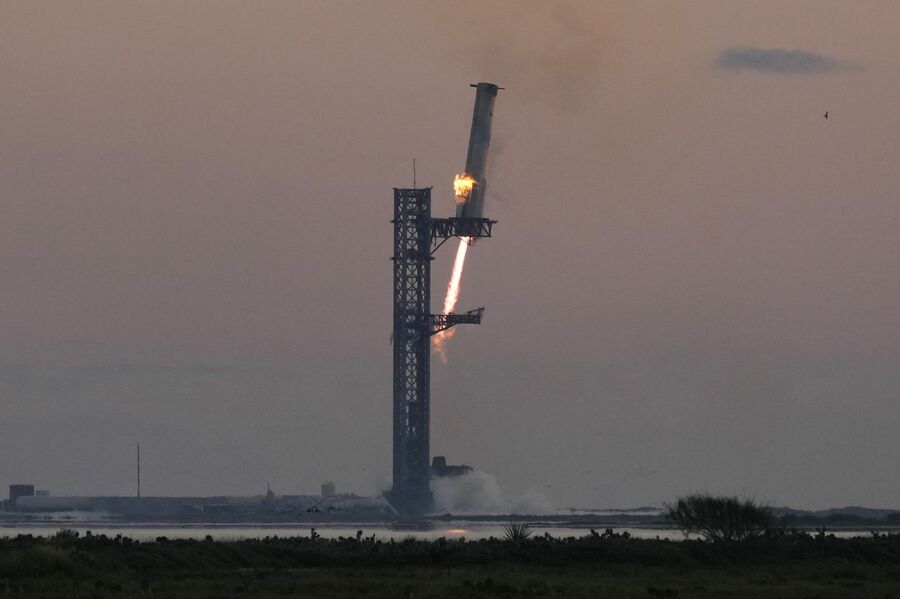 昨年10月、スペースXは「スターシップ」5回目の飛行試験でブースター「スーパーヘビー」の回収に成功した(写真:AP/アフロ)