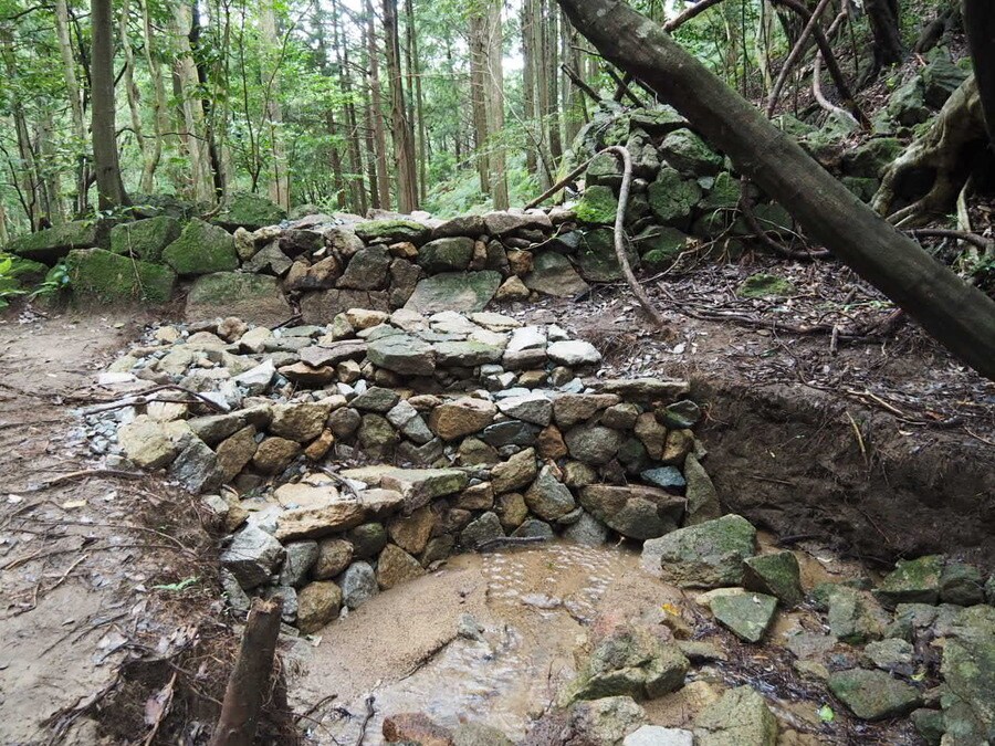 尾鷲市とLocal Coop 尾鷲のワークショップで修復した砂防堰堤。土砂に埋まっていたが、泥をかき出し、石を積み直した