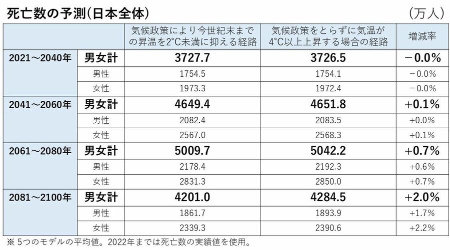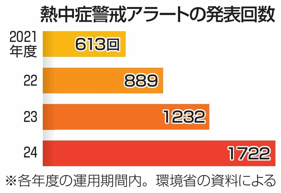 気候変動と死亡率の予測、「男性より女性」「夏場より過ごしやすい季節」「大都市より地方」の死亡数が増加する理由 気候変動対策を何も行わないと、死亡数の増加が膨らむ可能性が高い(写真はイメージ、Piyaset/Shutterstock.com) (画像1/5) 西日本豪雨で広域に浸水し、大きな被害が生じた岡山県倉敷市真備町地区(2018年7月、写真:共同通信社) (画像2/5) 夏の暑さが年々厳しくなっている日本(写真:Xinhua/ABACA/共同通信イメージズ) (画像3/5) 拡大画像表示 (画像4/5) 年々増えている熱中症警戒アラートの発表数(グラフ:共同通信社) 拡大画像表示 (画像5/5) 気候変動と死亡率の予測、「男性より女性」「夏場より過ごしやすい季節」「大都市より地方」の死亡数が増加する理由 この写真の記事を読む