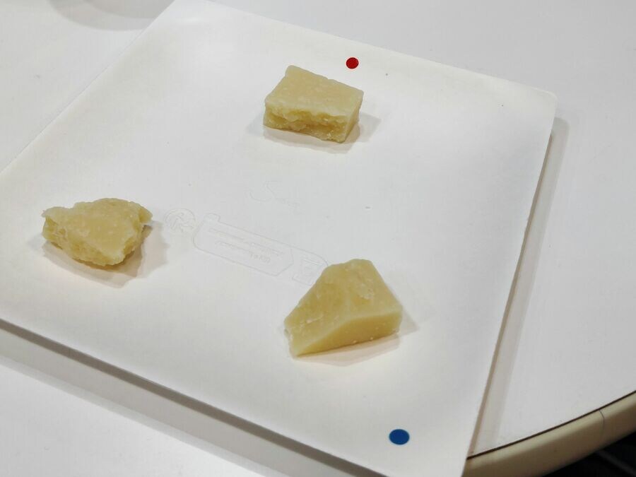 写真3:試食したチーズ。手前(青いシール)から左回りに熟成10カ月、18カ月、24カ月(筆者撮影)