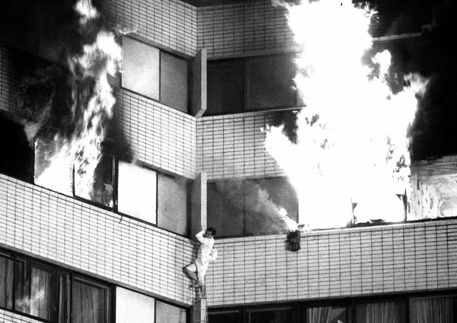 ホテルニュージャパンの火災では、窓から飛び降りて命を落とした人もいた。写真はホテルの外壁にしがみついて救助を待つ宿泊客(写真:共同通信社)