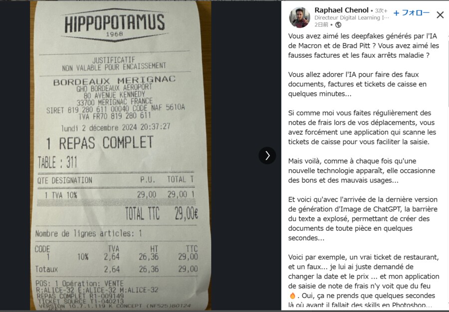 LinkedIn上で公表された偽レシートの生成画像