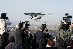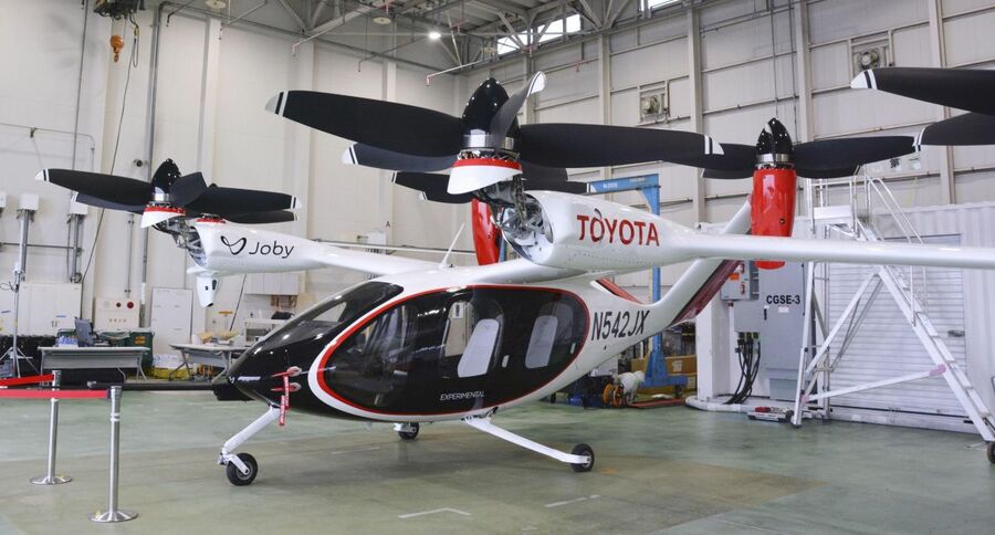 トヨタ自動車と米新興企業のジョビー・アビエーションが公開した「空飛ぶタクシー」の機体(2024年11月、写真:共同通信社)
